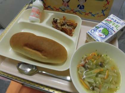 ・黒糖パン ・牛乳 ・じゃがいものミートグラタン ・スープ ・発酵乳 です。