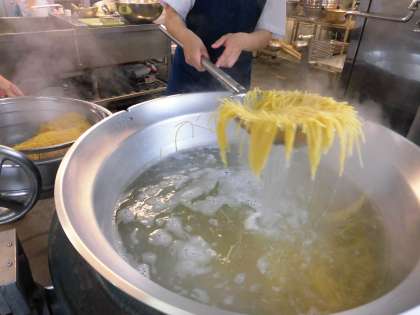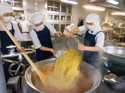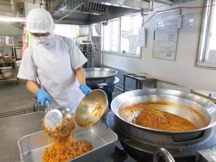 今日は、みんなに大人気の「スパゲッティミートソース」です。具を炒めておいたところに、茹でたてのスパゲッティを入れて、さらに炒めます。