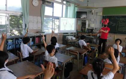 「ザリガニはかせになろ」のめあてで、子どもたちは、ザリガニについて知りたいことをいっぱい発表しました。「カニ?エビ?どちらだろう?」「オスとメスのちがいは?」「水はどこからのんでいるのだろう」等、映像を見て考えました。