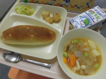 ・おさつパン ・牛乳 ・いかてんぷら ・フレッシュトマトのスープ煮 ・サワーソテー です。