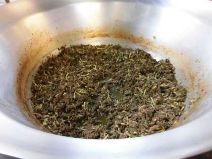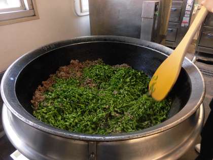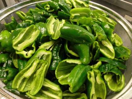 給食では、牛肉と細切りのピーマン、たけのこを一緒に炒めています。ピーマンは、宮崎県産のものが届きました。