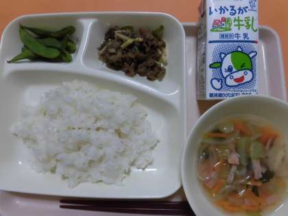 ・ごはん ・牛乳 ・チンジャオニューロウスー ・ハムと野菜の中華スープ ・えだまめ  です。
