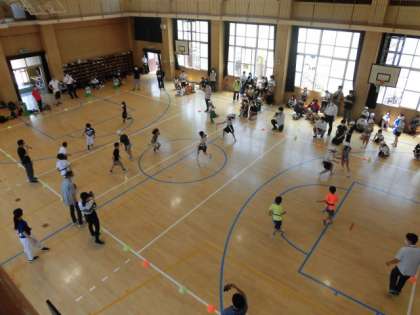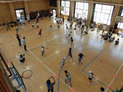 しっぽをつけてエリアの中を自由に走り回る。しっぽを足られないようにしながら、相手チームのしっぽをとる。自分のしっぽがとられたら、エリアの外に出る。低学年・中学年・高学年(中学生も含む)の3試合を行う。