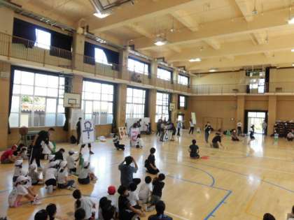 Pペーパーを2枚持って、ボードのところまで走って貼る。(最終的にハングルを一文字完成させる)もどってきて、次の人と交代(リレー方式)する。全チームの文字を合わせると、ウリチング(わたしたちの友だち)が完成する。