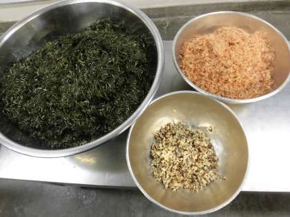 かつおぶし、しいたけ、きざみのりを甘辛く味付けして、煮つめてつくだ煮にしています。ごはんがとても進みますよ。