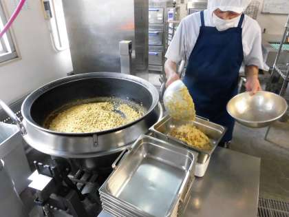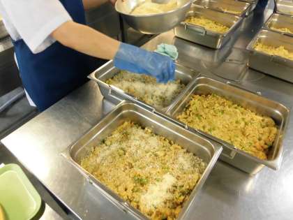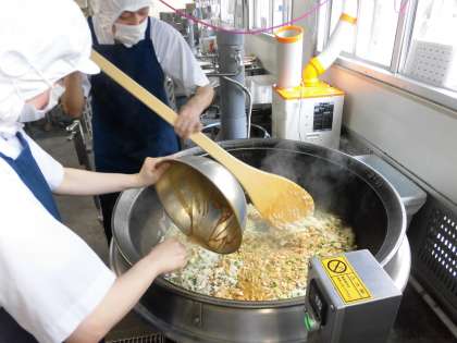 給食では、鶏肉とたまねぎ、グリンピース、米を釜で煮たものを、ミニバットに入れて、焼き物機で焼いています。表面にふったパン粉と粉チーズの焦げ目が香ばしく、カレー味もとても好評です。