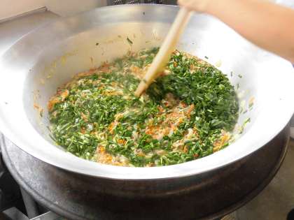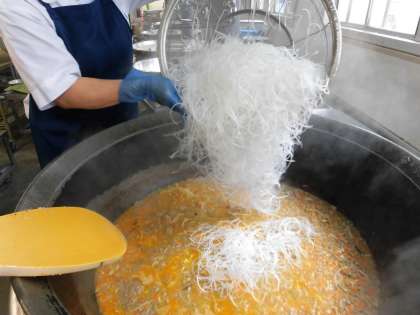 はるさめは、めんのような形をしています。給食では、じゃがいものでんぷんから作ったはるさめを使っています。