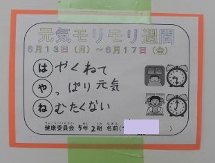 6月13日(月)の児童朝会で、各委員会(健康・給食・運動)から、「元気モリモリ週間」の内容について発表と呼びかけがありました。