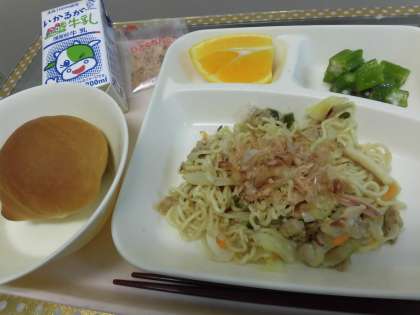 ・黒糖パン(1/2) ・牛乳 ・和風焼きそば ・オクラの甘酢あえ ・オレンジ  です。
