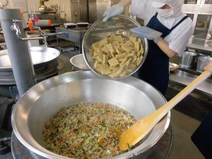 今日の焼きそばは、しょうゆで味付けした和風焼きそばです。かつおぶしをかけて食べましょう。