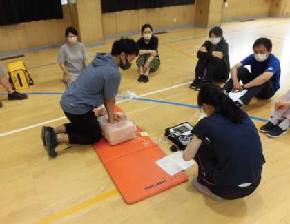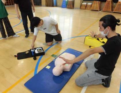 今月から、体育科で水泳指導が始まります。それに向けて、体育館で、救命救急講習会を実施しました。胸骨圧迫など心肺蘇生とAEDを使った一次救命処置を中心に、講習会を進めていきました。DVDの視聴後、3グループに分かれて、練習用の人形とAEDを使って実施しました。