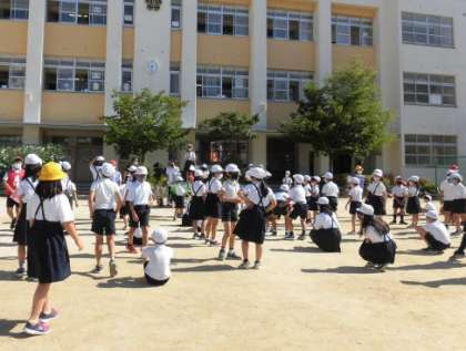 今日の集会は、「〇×クイズ」でした。北巽小学校に関するクイズ、アニメについて、その他日常に関するクイズが出されました。班ごとに相談し、○であれば立ち、×であれば座ることになっていました。子どもたちは暑い中でしたが、班で協力して参加していました。