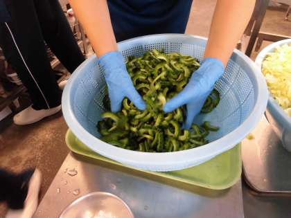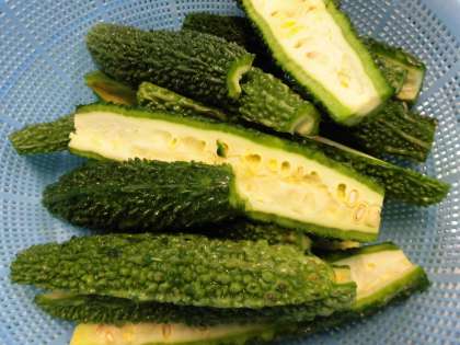 にがうりは、種の周りのワタの部分をしっかり取り、塩で下味をつけて、ツナと一緒に食べることで、苦みを減らして食べやすくしています。
