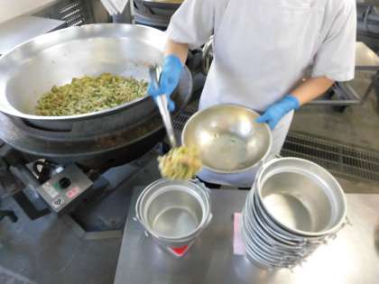 夏野菜をたっぷり使ったキーマカレーライスと、ツナとキャベツ、にがうり(ゴーヤ)を炒めてマヨネーズをかけて食べる献立に、ミックスフルーツがついています。