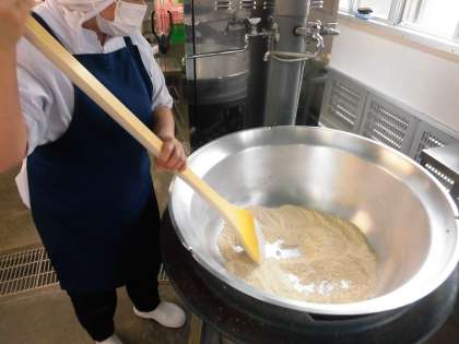 釜で具を煮てから、焼き物機で焼いています。小麦粉をからいりし、粉っぽさをなくしてだまにならないように入れています。