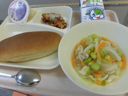 ・黒糖パン ・牛乳 ・かぼちゃのミートグラタン ・スープ ・ぶどうゼリー です。
