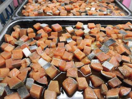 さけは、料理酒、砂糖、こいくちしょうゆで下味をつけて、焼き物機で焼いています。