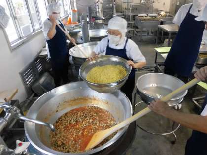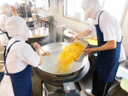 ・黒糖パン(1/2) ・牛乳 ・チキントマトスパゲッティ ・グリーンアスパラガスとキャベツのサラダ ・みかん(冷) です。