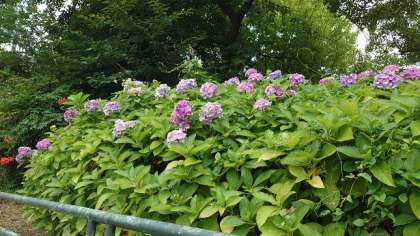 「梅雨のころに花びらのような4,5枚のがく片をもつ花をびっしりとかためて咲かせる。」とありました。校庭では、花をびっしりと咲かせることができませんでしたが、生野区役所の近くの御勝山南公園にアジサイの花が咲いていましたので写真を撮りました。