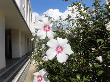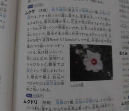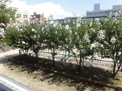 今日は、7月にも咲いている「ムクゲ」について調べてみました。図書室にある総合百科事典『ポプラディア』で調べてみました。「庭木や生け垣に利用される。6月から10月、花弁が5枚で、直径5cmから10cmのピンクや白、赤紫の色の花を葉の付け根にひとつずつつける。花は朝ひらいて、夜にはしぼみ、翌朝に再び開く。韓国では国花として親しまれている。」ということがわかりました。「アジサイ」は、生野区の花といわれているようです。次は、「アジサイ」について調べてみることにしました。