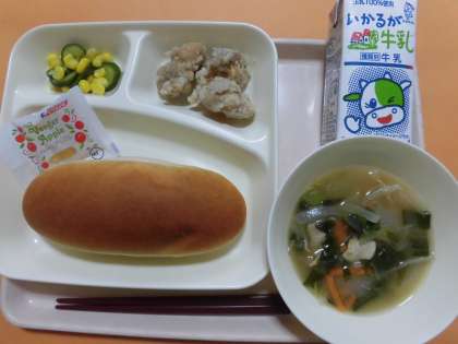 ・コッペパン ・牛乳 ・鶏肉のからあげ ・中華みそスープ ・きゅうりとコーンの甘酢あえ ・りんごジャム です。