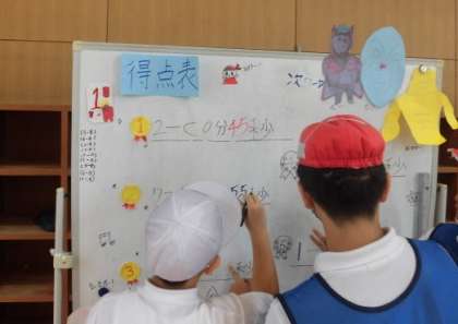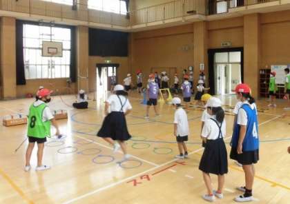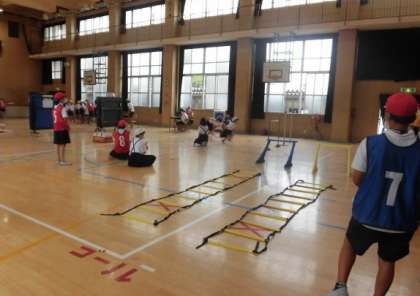 体育館の広さをうまく使って、とび箱・フラフープ・ハードル・ラダーなどを障がい物にいて、工夫したコースをつくりました。跳んだり、くぐったり、飛び越えたりしながら、ゴールをめざします。ごれだけ速くゴールできるか。さぁ、チャレンジ!