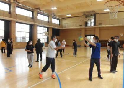 はじめは、低学年向け体育授業に取り入れる運動項目(ボール運動・体操運動・単的運動)について、内容説明がありました。同時に、教員は各運動項目を実践しました。