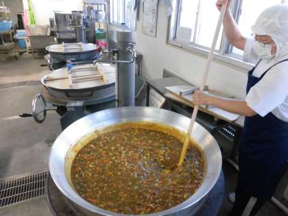 いつもの給食のカレーライスは、小麦粉・カレー粉・香辛料などから作られたカレールウの素を使っていますが、今日は小麦粉の代わりに米粉を使ったカレールウの素を使っています。