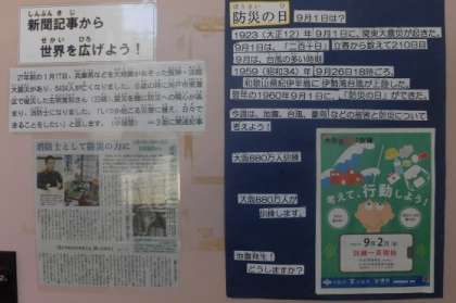 校長室の前には、防災の日について詳しく掲示しています。見てください。新聞記事では、阪神・淡路大震災の時6歳であった人が、27年後消防士になって「いつ起こる災害に備えて、日々できることをしたい」と話しています。