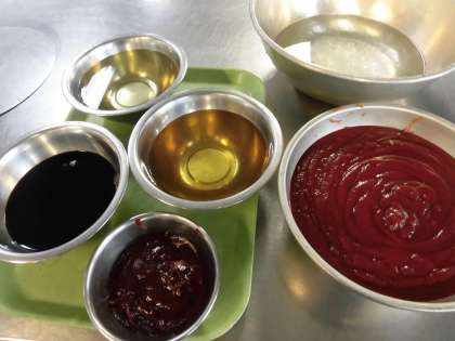 給食では、料理酒・みりん・こいくちしょうゆ・ケチャップ・コチジャンで作っています。