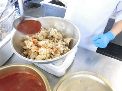 衣をつけた鶏肉を油で揚げて、ヤンニョムをからめています。