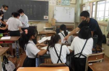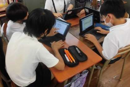 タブレットを使って、集会のアイディアを共有しながら考えていきました。実際に、児童集会のゲームのルール説明や司会進行のセリフを考えました。
