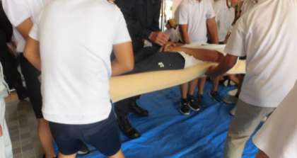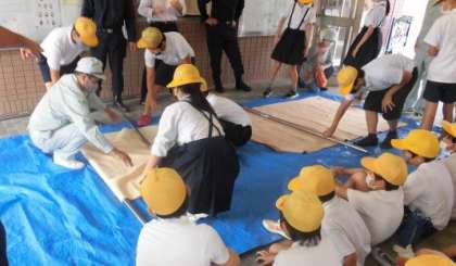 地震などの災害が起きた時、近くの担架を使って救助活動ができます。緊急時に担架が近くになかっても、棒と毛布などを使って担架をつくり、救助活動ができることを学びました。