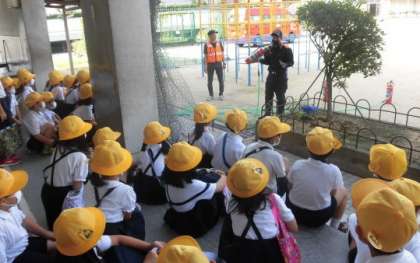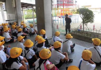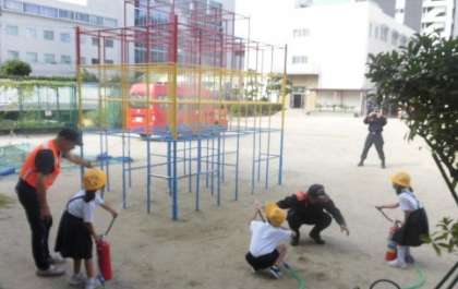 消火器の使い方について学び、実際に、水消火器を使って消火訓練を体験しました。