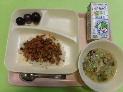 ・ごはん ・牛乳 ・野菜たっぷりカラフルライス ・キャベツときのこのスープ ・ぶどう(巨峰)