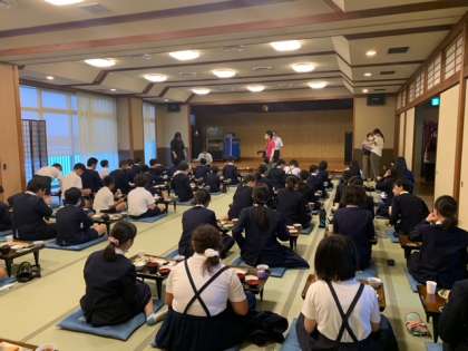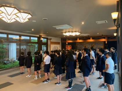 大きな体調不良者や怪我もなく、1日目を終えることができました。今朝はあいにくの雨なので、朝の集いはロビーで行いました。
