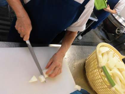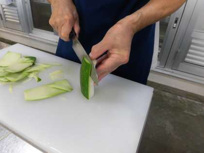 食べやすい大きさに切って、青臭さを取るために一度下ゆでをしています。とても柔らかいので、崩れてなくなってしまわないように気を付けて混ぜて作ってくださいました。