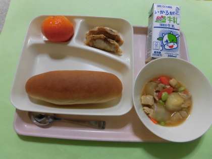 ・黒糖パン ・牛乳 ・あげぎょうざ ・鶏肉ととうがんの煮もの ・みかん(冷)  です。