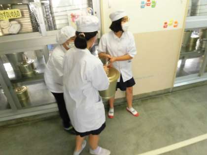 給食室前には、毎日サンプルケースを置いています。「どこに入れるのかな?」「いくつずつかな?」と、給食当番さんが確認しています。