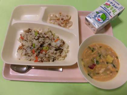 ・牛乳 ・もずくと豚ひき肉のジューシー ・さつまいものみそ汁 ・焼きれんこん です。