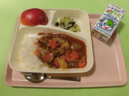 ・牛乳 ・ハヤシライス[米粉] ・キャベツのひじきドレッシング ・りんご です。