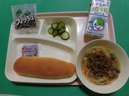 ・コッペパン ・牛乳 ・タンタンめん ・きゅうりの甘酢づけ ・ミニフィッシュ ・いちごジャム です。