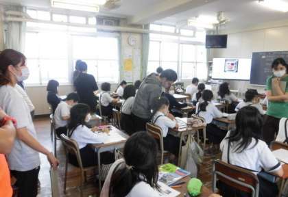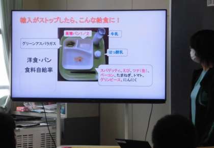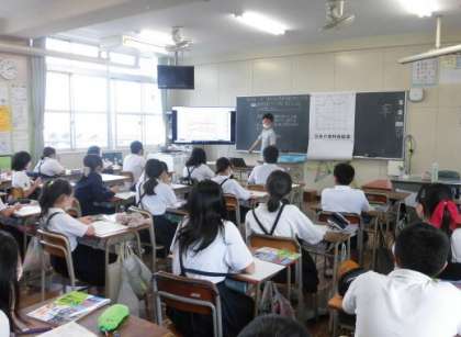 北巽小学校では、校内の全体研修会は、大学と連携した算数科授業研究を実施しています。これとは別に、若手教員が授業力向上のため、主体的に授業参観と討議会を実施しています。今回は、5年生の社会科の授業「これからの食料生産とわたしたち」を授業参観しました。社会科授業の担当と食育の授業担当が、連携して授業をしました。