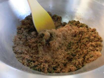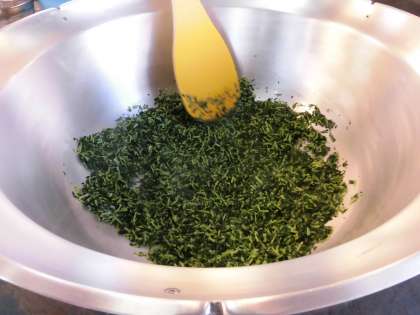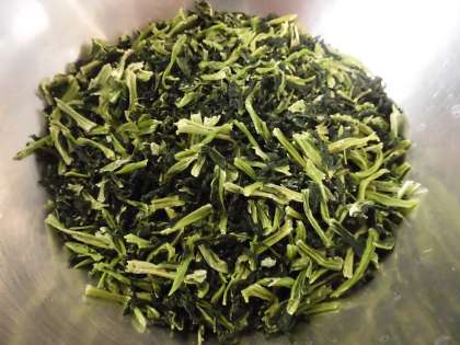 だいこん葉、かつおぶし、いりごまを炒めて、味付けしています。だいこん葉は、だいこんの葉の部分を乾燥させたものを使っています。