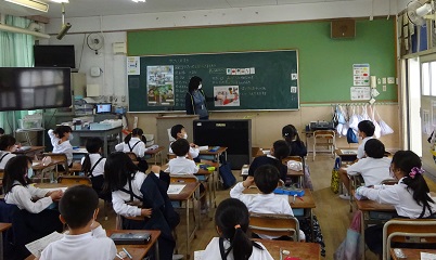 1年生は、給食ではじめて口にする食べ物もあり、いろいろな食べ物に興味をもつ時期でもあります。初めに、いろいろな野菜の名前を調べました。次に、食品カードを提示しました。すべてが、今日の給食に使われていることを知らせると、子どもたちは驚いていました。今日の給食の食材の中から野菜を選びました。いろいろな野菜が、給食に使われていることがわかりました。最後に、野菜は、「緑色グループ」の食べ物で、体の調子をととのえる働きがあることを知りました。今日の学習によって、好き嫌いなく何でも食べるようになるといいです。毎日、給食を食べることで、苦手な食べ物も少しずつ食べることができるようになることを大切にしていきたいものです。