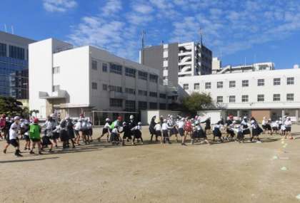 今日のゲームは、「だるまさんがころんだ」です。ルールは、班で手をつなぎ円になります。集会委員会の人が、「だるまさんがころんだ!」といいます。その間に、スタートラインから、ゴールラインまで行きます。つないでいた手が離れたり、動いてしまったりすると、スタートラインにもどります。1年生から6年生のあおぞら班で協力してゴールラインをめざしていました。