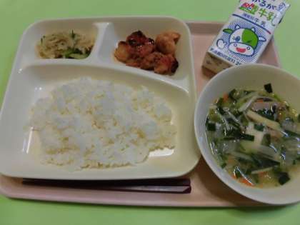 ・ごはん ・牛乳 ・鶏肉のチリソース焼き ・焼き豚とワンタンの皮のスープ ・切干しだいこんのごま辛みづけ です。
