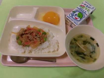 ・牛乳 ・ピリ辛丼 ・中華スープ ・黄桃(缶) です。