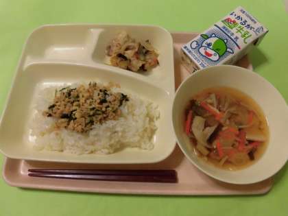 ・ごはん ・牛乳 ・鶏肉のゆず塩焼き ・ソーキ汁 ・ツナ大豆そぼろ です。