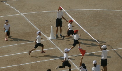 1年生は、「しんじだいをかけぬけろ!」個人走と「ポポポポポーン」団体競技をしました。